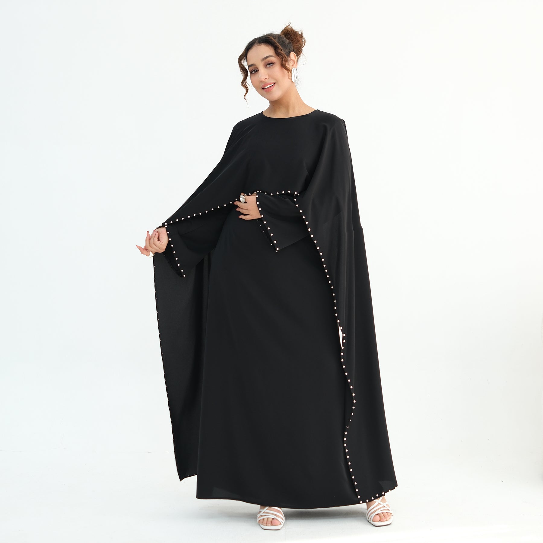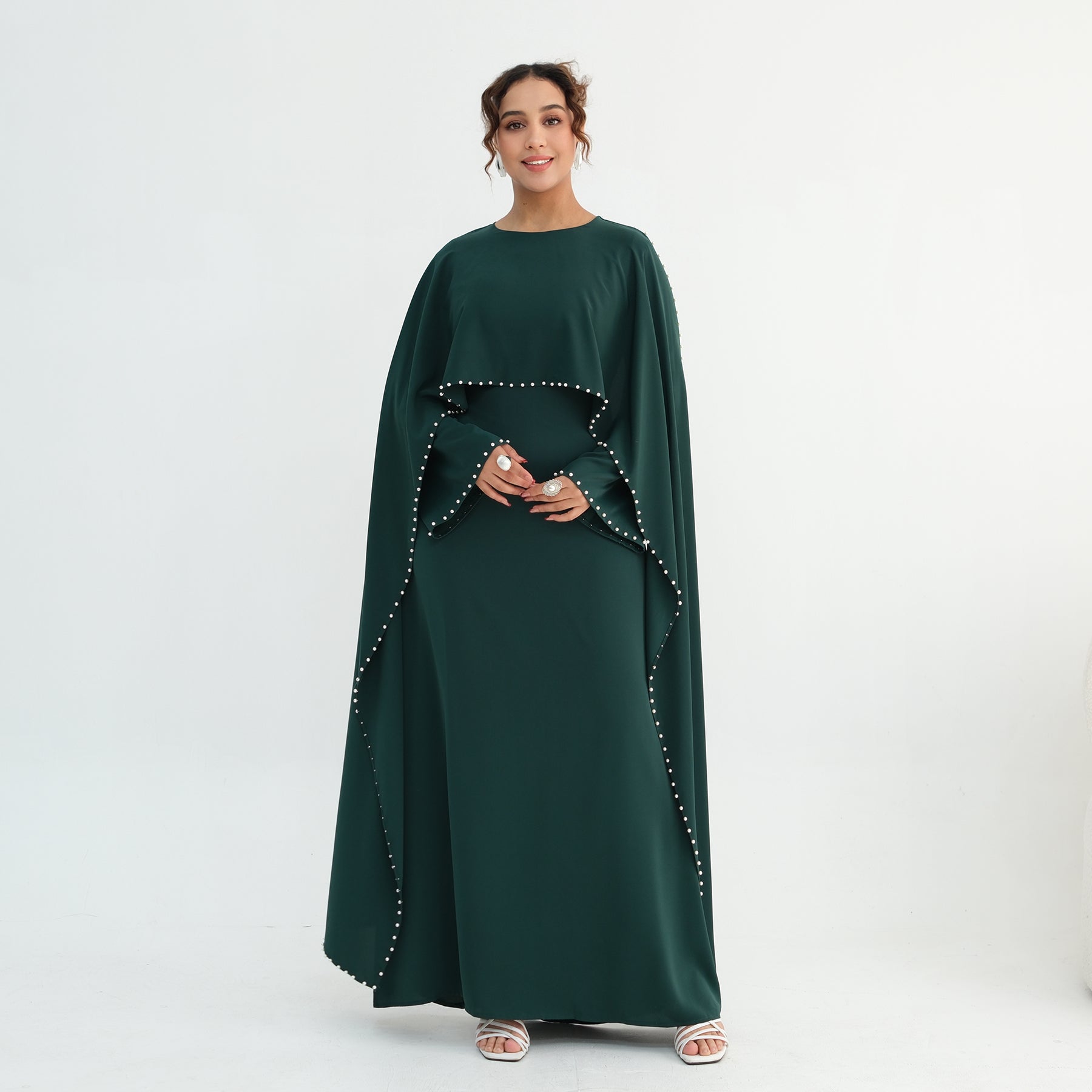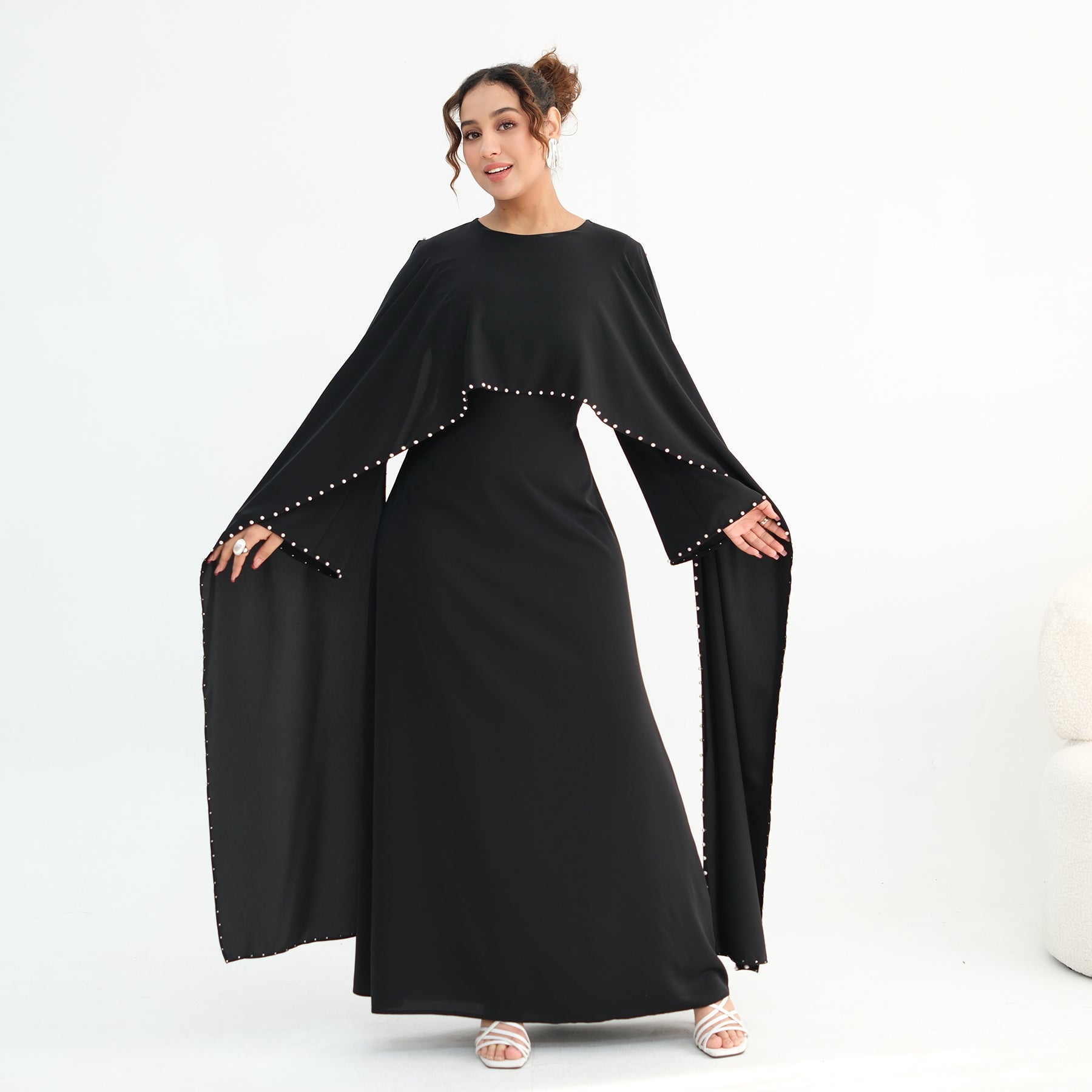 Elevate your modest wardrobe with this luxury pearl and diamond embellished cape abaya, designed for women who appreciate elegance and refinement.