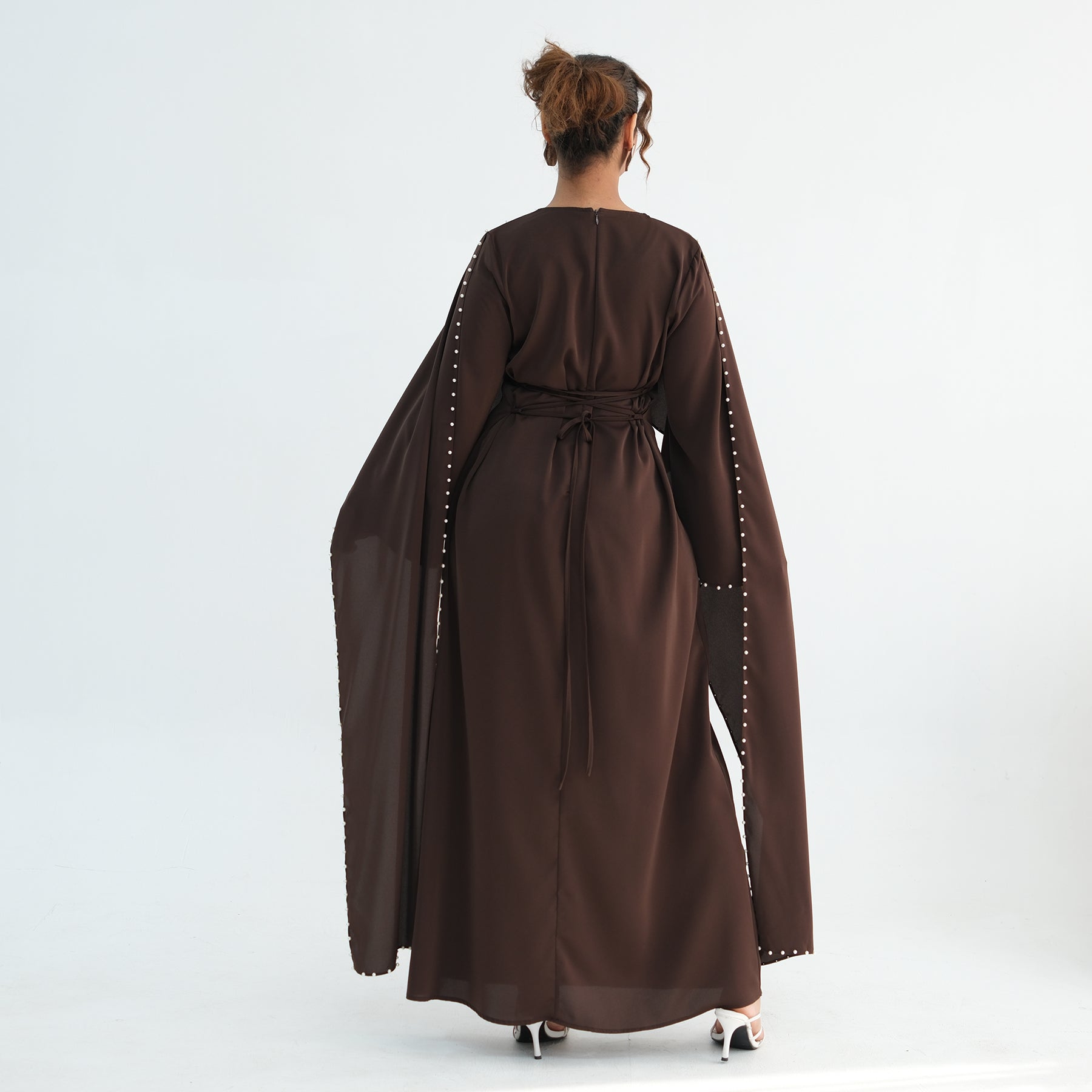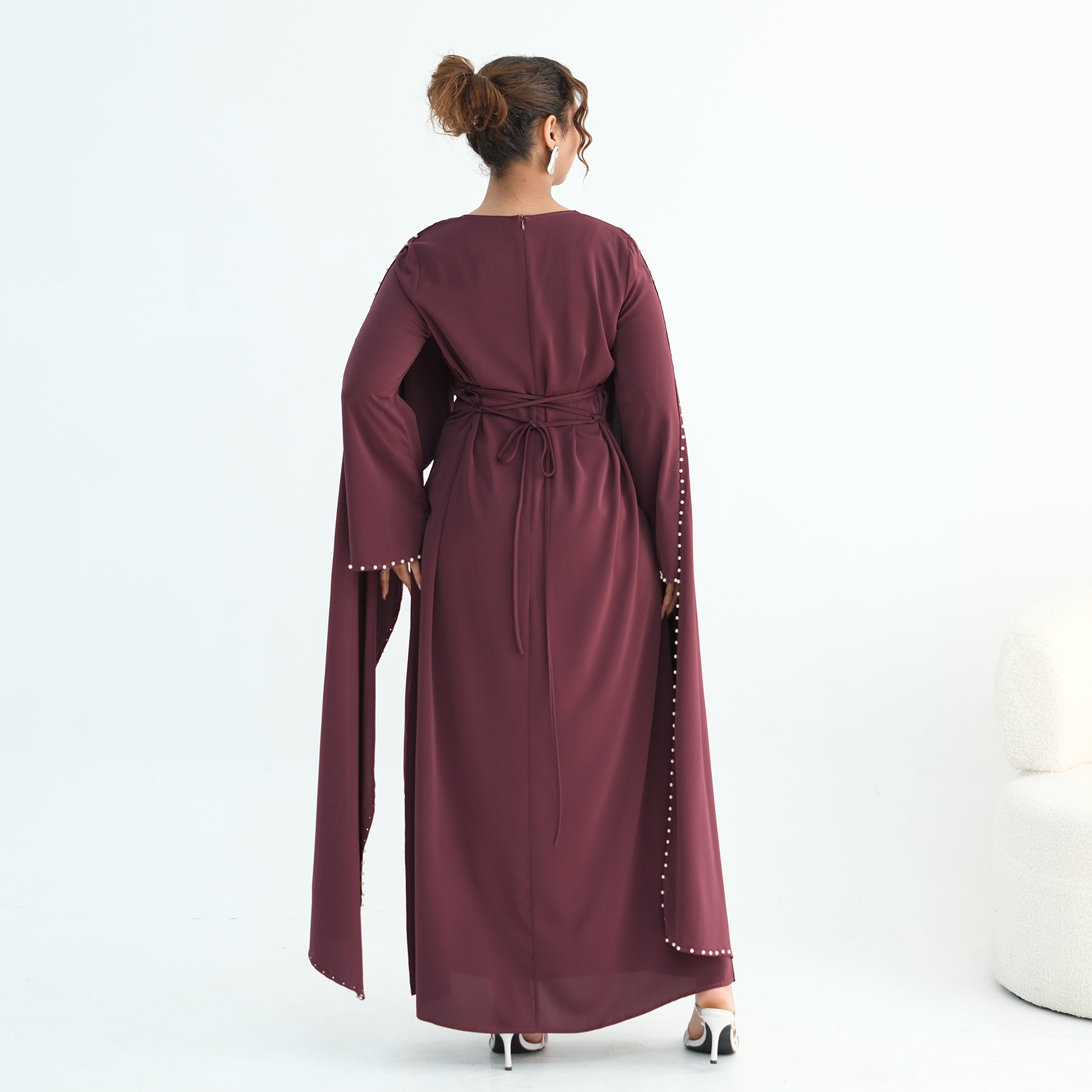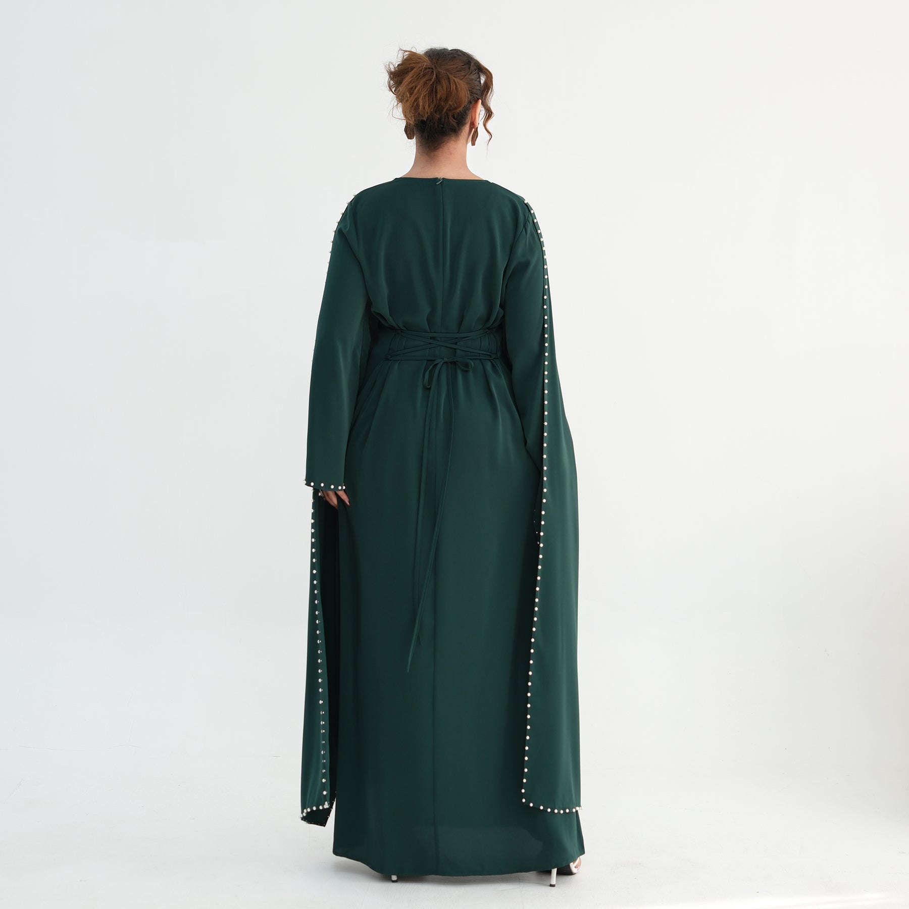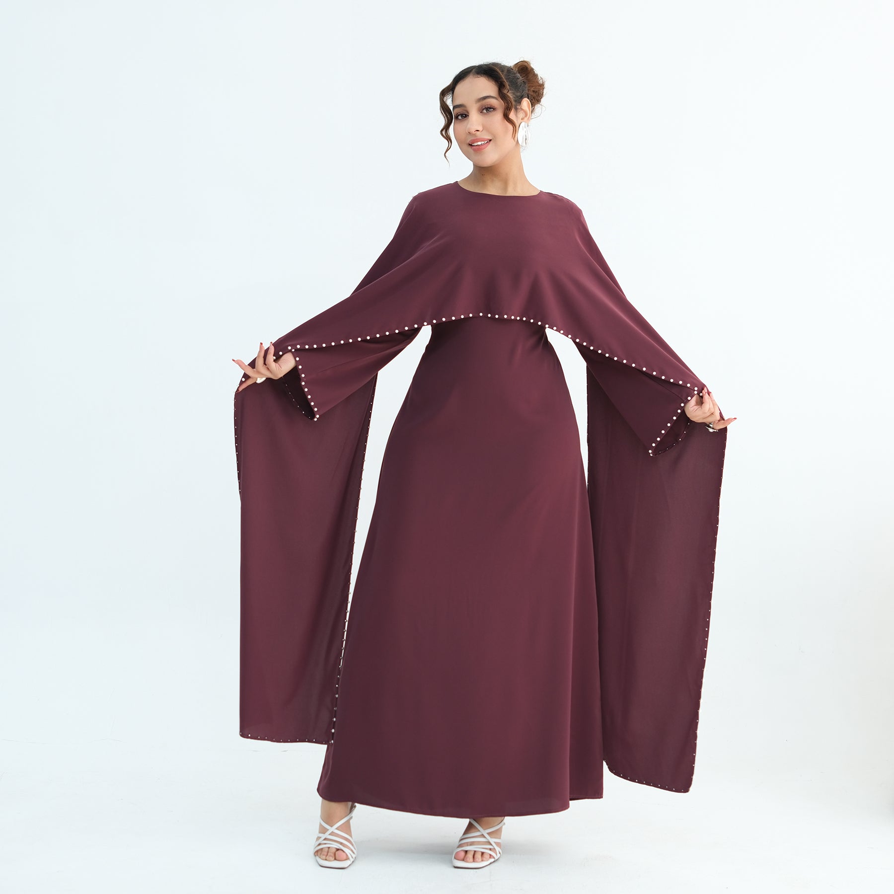 Elevate your modest wardrobe with this luxury pearl and diamond embellished cape abaya, designed for women who appreciate elegance and refinement.