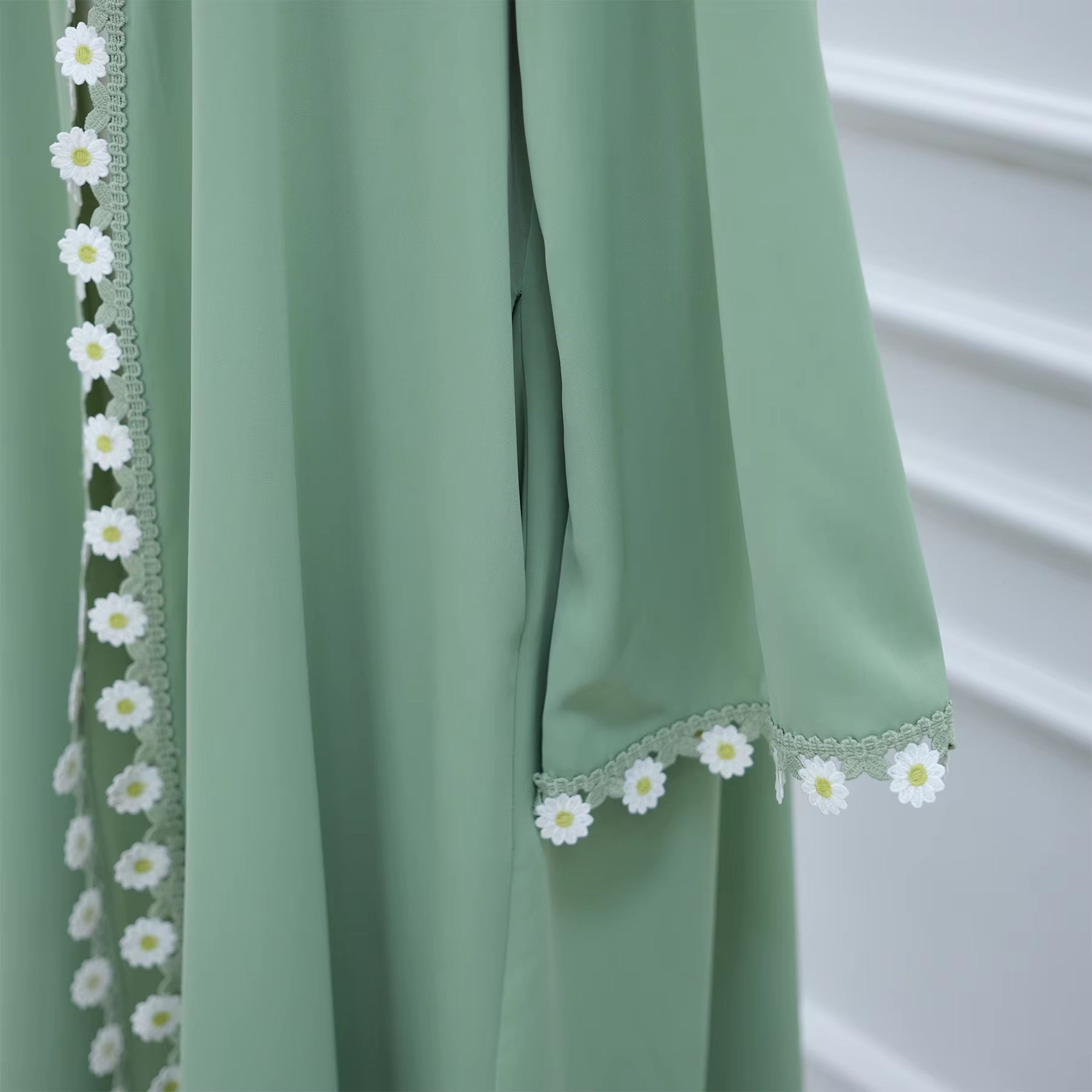 Bring elegance to your modest wardrobe with the Nura Floral Patchwork Open Abaya in refreshing mint green and pink.