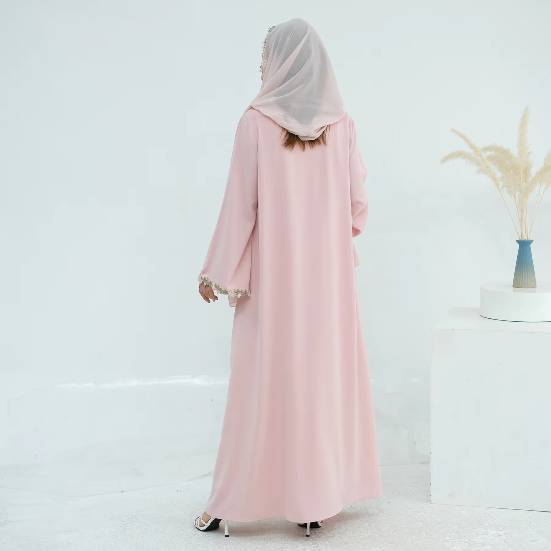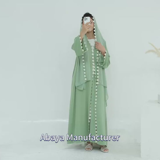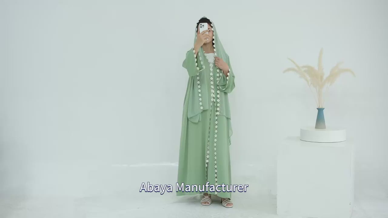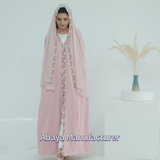 Designed with delicate floral patchwork details, this open-front kimono abaya creates a soft, graceful silhouette perfect for everyday wear and special occasions.
